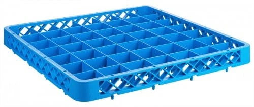 Geschirrspülkorb GLAS/TASSE mit Facheinteilung aus hellgrauem Polypropylen, DIN 66075-F (50 x 50 cm), stapelbar, hitzeresistent bis +120°C, durch blaue Aufsätze lässt sich die Nutzhöhe um jeweils 4 cm erweitern