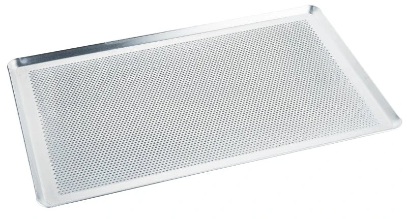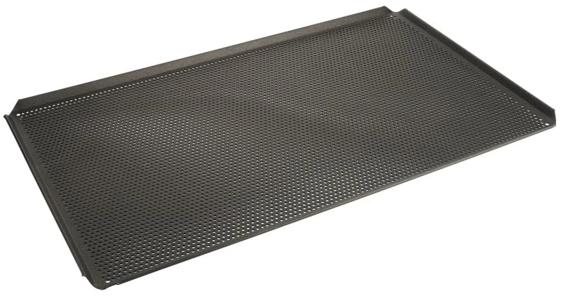 Antihaft-Backblech, perforiert in Größe Gastronorm GN 1/1, aus 1,5 mm starkem Aluminium, mit roter Beschichtung aus Silikon, Ränder 45° mit offenen Ecken, 3 mm Perforierung, nicht spülmaschinengeeignet