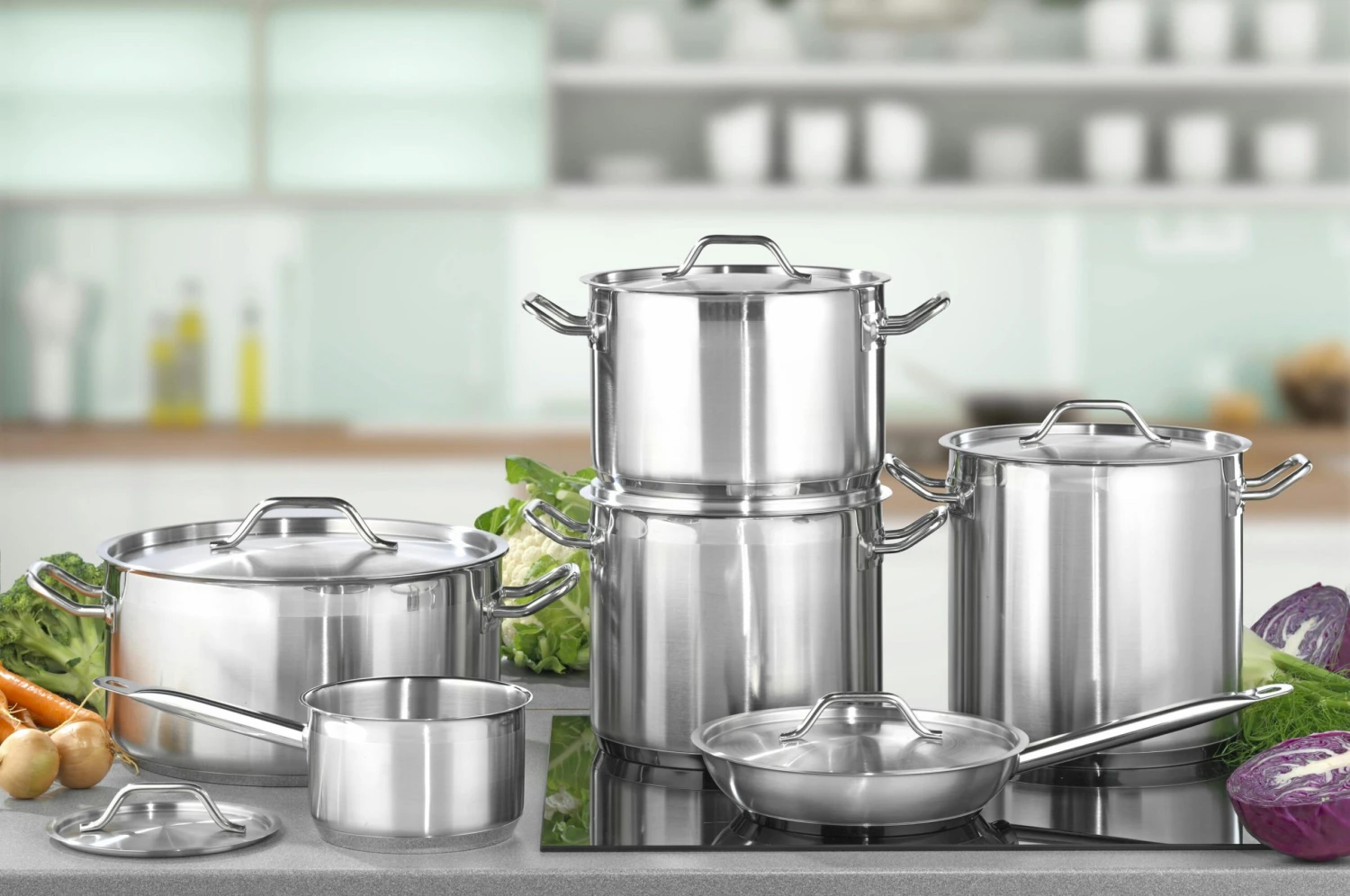 Bratentopf, aus Edelstahl 18/10, seidenmatt gebürstet mit (bis Ø 32 cm hochglänzendem) Schüttrand, verkapselter Sandwichboden, induktionsgeeignet, handliche Vollprofil-Kaltgriffe mit Schutzplatten, extra schwere Qualität