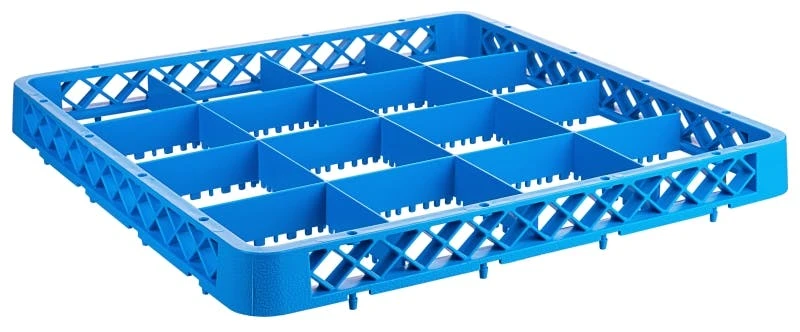 Erweiterungselement passend auf Geschirrspülkorb GLAS/TASSE 2518/036, mit Facheinteilung aus hellgrauem Polypropylen, DIN 66075-F (50 x 50 cm), stapelbar, hitzeresistent bis +120°C, durch blaue Aufsätze lässt sich die Nutzhöhe um jeweils 4 cm erweitern