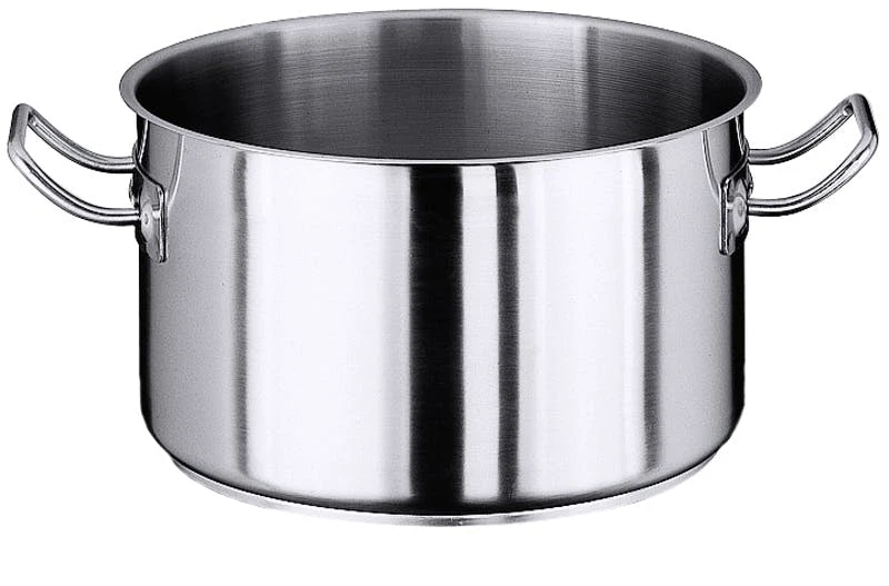 Kochtopf, niedrig, aus Edelstahl 18/10, seidenmatt gebürstet mit (bis Ø 32 cm hochglänzendem) Schüttrand, verkapselter Sandwichboden, induktionsgeeignet, handliche Vollprofil-Kaltgriffe mit Schutzplatten, extra schwere Qualität
