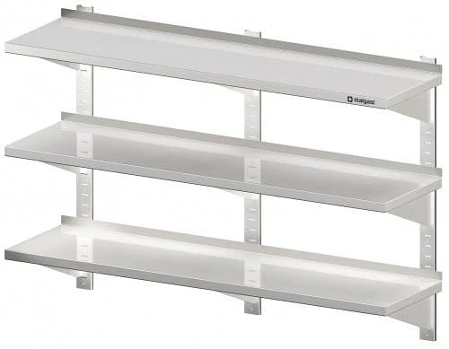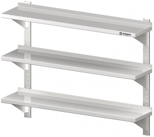 hergestellt aus rostfreiem, ferritischem Stahl, Höhe 930 mm, Aufkantung hinten, 30 mm Höhe, ab einer Breite von 1400 mm mit drei Konsolen und Wandschienen ausgestattet