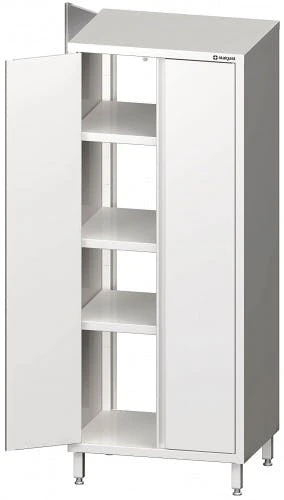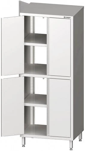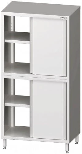 hergestellt aus rostfreiem, ferritischem Stahl, fest verschweißte Ausführung, höhenverstellbare Füße +25 mm bis -4 mm, Schrankbeine aus Vierkantprofil 40×40 mm, Materialstärke: 1,2 mm, Schrankinnenraum mit zwei höhenverstellbaren Einlegeboden, mittlerer Schrankboden fixiert, Schiebetüren sind doppelwandig ausgeführt, mit durchgehender Griffleiste, Führungsschiene der Schiebetüren aus Edelstahl, mit Führungszapfen in der unteren Schiene, Schiebetüren laufen und hängen auf Rollen