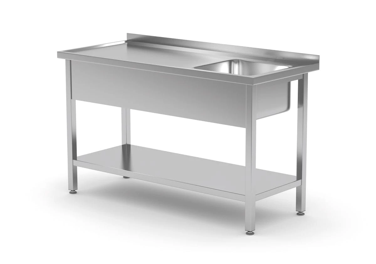 Der Gastro-Spültisch mit Ablagefach & Schiebetüren wird aus rostbeständigem Stahl AISI 430 hergestellt und erfüllt alle erforderlichen funktionellen Anforderungen der professionellen Gastronomie. Er ist mit einer Aufkantung in Höhe von 4cm sowie einer Frontabdeckung ausgestattet, die für zusätzlichen Schutz sorgen. Verstellbare Füße machen den Tisch zudem sehr flexibel. Erhältlich ist der Spültisch in mehreren Größen, die sich jeweils in der Tiefe und Breite unterscheiden.