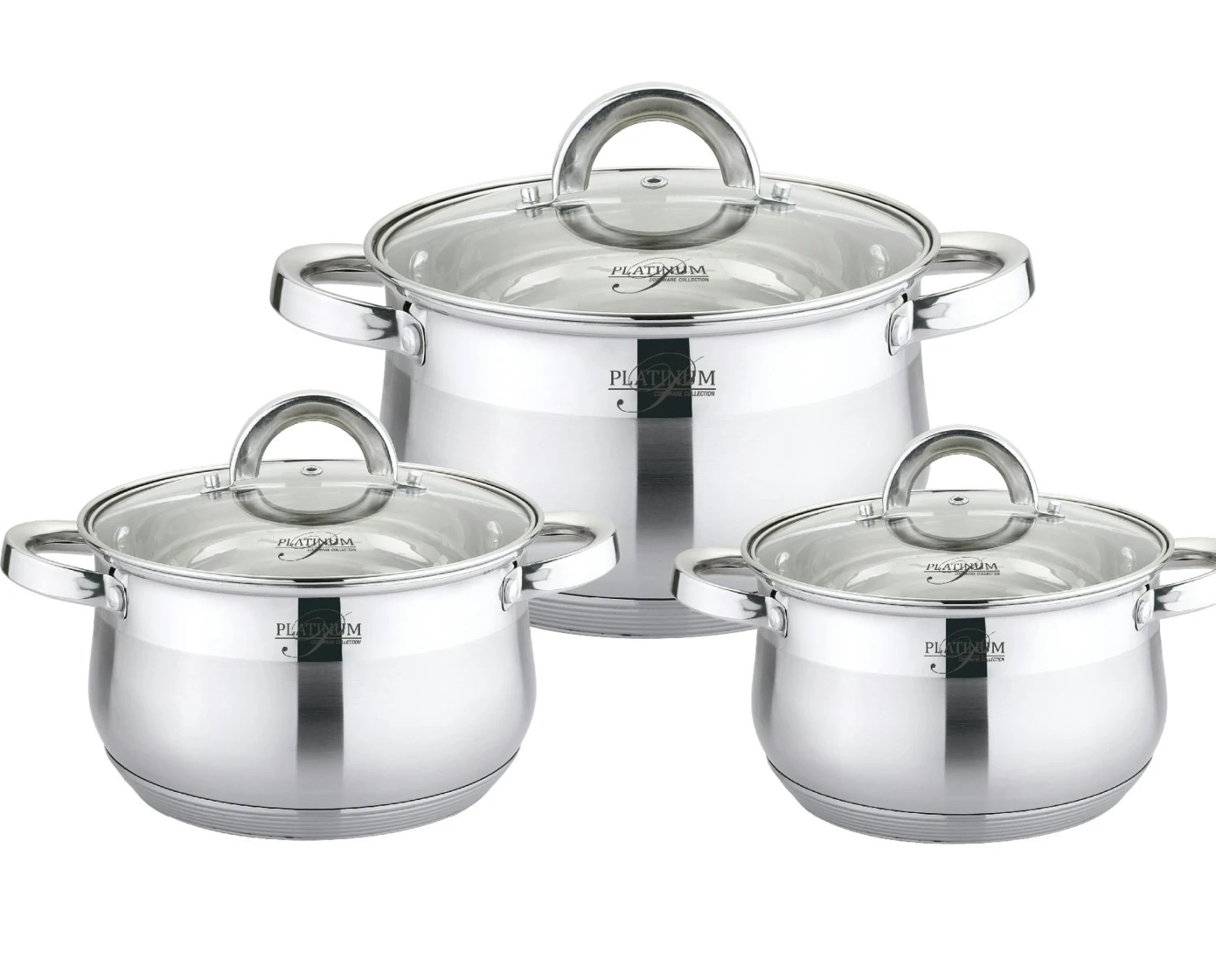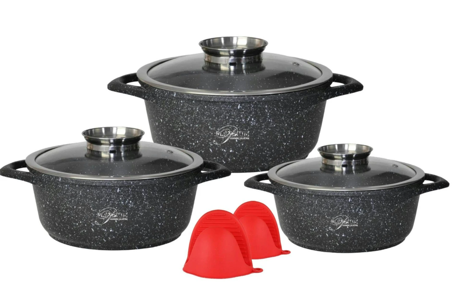 Mit diesem 6- Geschirrset können Sie die köstlichsten Gerichte zubereiten. Das Set besteht aus drei Töpfe mit Deckel. Die Töpfe sind aus Aluminium Guss gefertigt und mit einer 3-Schicht-Marmorbeschichtung versehen. Sie können für alle Arten von Wärmequellen verwendet werden.