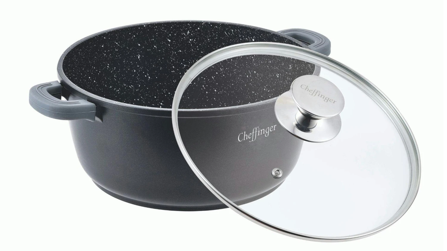 Es besteht aus Aluminiumguss und hat eine 3-schichtige Marmorbeschichtung und abnehmbare Silikongriffe. Es kann auf alle Arten von Wärmequellen verwendet werden und es kann auch im Ofen bis 240 Grad eingesetzt werden. Der mitgelieferte Deckel besteht aus gehärtetem Glas und es hat einen Edelstahlknopf