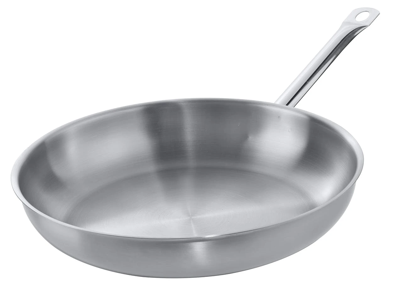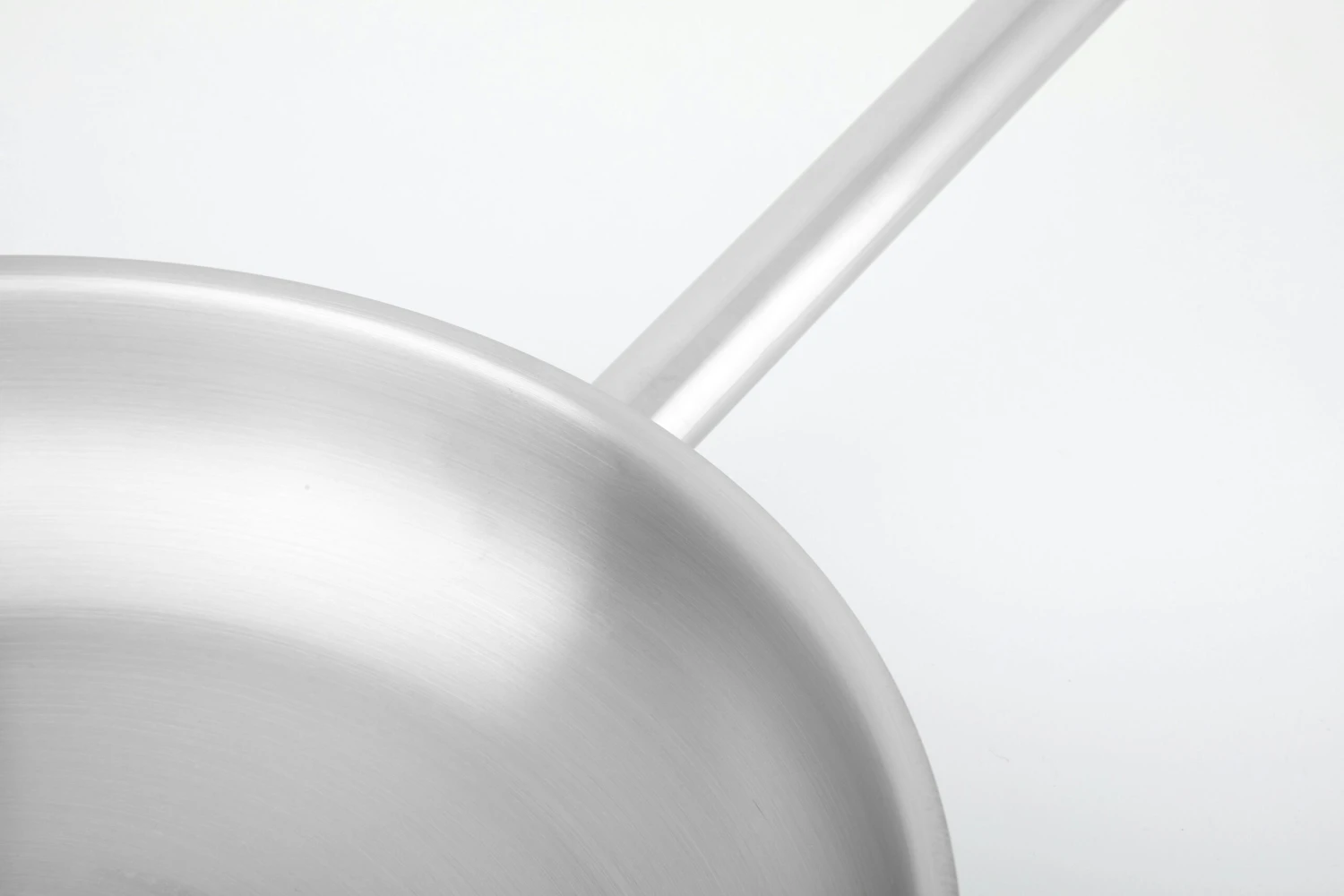 Die METRO Professional Edelstahlpfanne hat einen Durchmesser von 24 cm (Bodendurchmesser: 18 cm), eine Dicke von 0,8 mm und einen 4 mm dick Edelstahl-Sandwichboden mit Induktionsboden. Außerdem verfügt das Produkt über einen Edelstahlgriff und eine satinierte Außenseite aus Edelstahl 304. Die Pfanne ist für Elektro-, Gas-, Glaskeramik- und Induktionsherde geeignet.