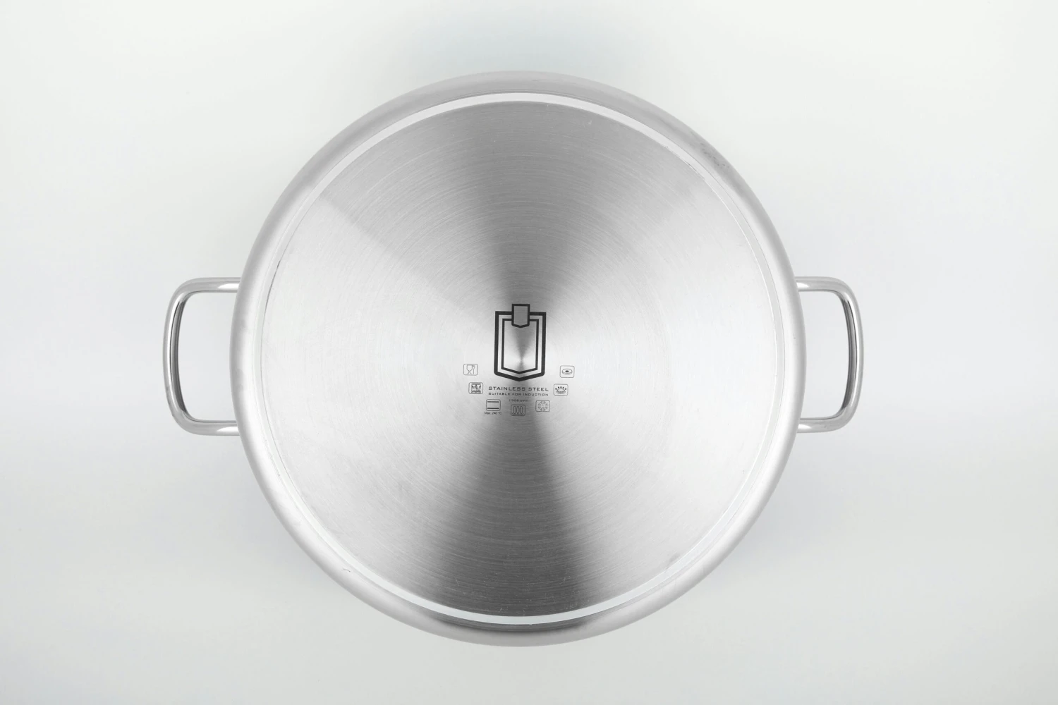Der METRO Professional Edelstahlfleischtopf hat einen Durchmesser von 16 cm. Das Produkt hat eine Höhe von 14,5 cm, eine Dicke von 0,6 mm und einen 3.5 mm Aluminium-Sandwichboden mit Induktionsboden. Außerdem verfügt das Produkt über einen Edelstahlgriff und eine satinierte Außenseite aus Edelstahl 304. Der Topf ist für Elektro-, Gas-, Glaskeramik- und Induktionsherde geeignet.