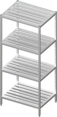 hergestellt aus rostfreiem, ferritischem Stahl, Ausführung: fest verschweißt oder zur Selbstmontage, Regalbeine aus Vierkantprofil 30×30 mm, Materialstärke: 1,2 mm, Regalböden mit Höhe von 40 mm, verstärkt durch um 15mm nach innen gebogene Böden, höhenverstellbare Füße +25 mm bis -4 mm, maximale Belastbarkeit der Böden 70 kg/m²