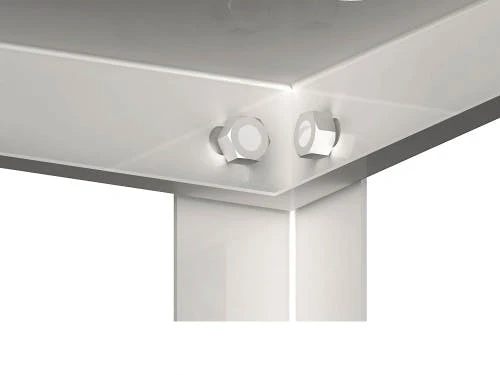 hergestellt aus rostfreiem, ferritischem Stahl, Ausführung: zur Selbstmontage, Regalbeine aus Winkelprofil 40×40 mm, Materialstärke: mindestens 1,5 mm, Regalböden mit Höhe von 40 mm, verstärkt durch um 15mm nach innen gebogene Böden, höhenverstellbare Füße +25 mm bis -4 mm, maximale Belastbarkeit der Böden 70 kg/m²