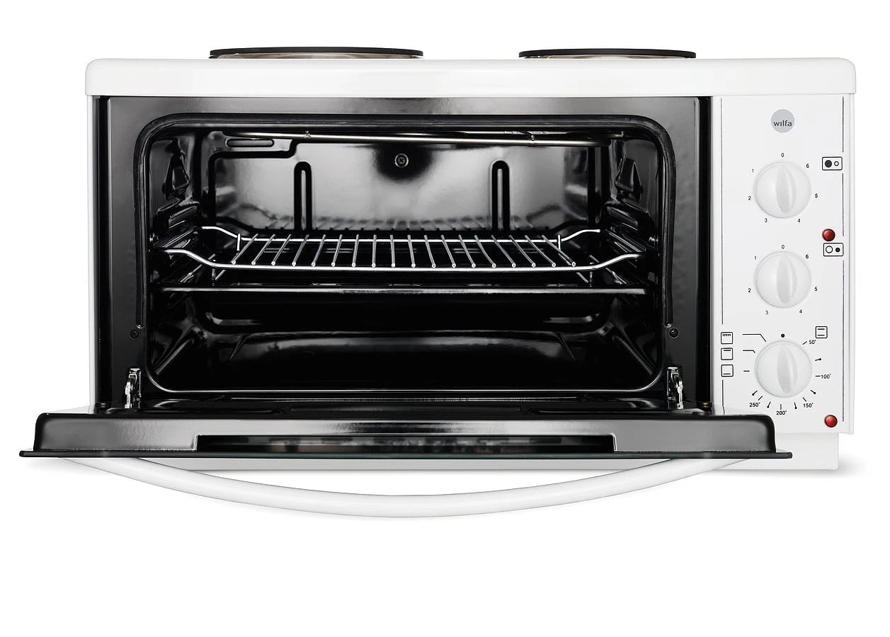 Mit dem Wilfa Mini-Ofen EMK218 lassen sich köstliche Gerichte einfach und schnell zubereiten. Auf der Oberseite des Geräts befinden sich zwei Kochplatten mit 1000 und 1200 Watt. Der kompakte Mini-Ofen passt ohne Probleme in jede Küche und er bietet mit 6 verschiedenen Hitzeeinstellungen genügend Auswahlmöglichkeiten, um die Gerichte je nach Bedarf zu erhitzen. Zudem besitzt der Ofen ein 22 Liter großes Innenvolumen und Sie können zwischen den Einstellungen Ober-/Unterhitze sowie Grillelement wählen. Um gleich mit dem Kochen starten zu können, wird Ihnen der Mini-Ofen inklusive einer Bratpfanne und Grillplatte geliefert. Mithilfe des verstellbaren Thermostats lässt sich die nötige Temperatur zum Kochen einstellen und die Signalleuchte zeigt an, ob das Gerät im Einsatz bzw. ob es noch heiß ist.